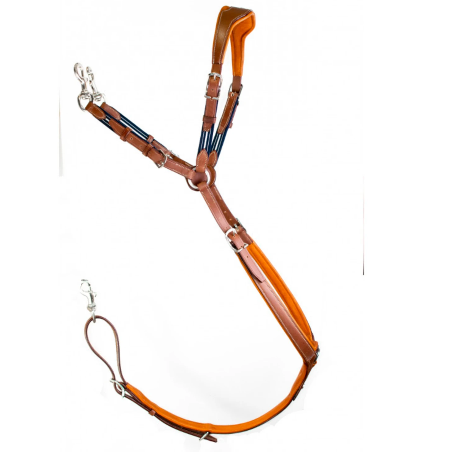Breastplate with removable, elastic long bridge. It maintains and balances the saddle while limiting the tension and allowing optimal freedom of the shoulders.