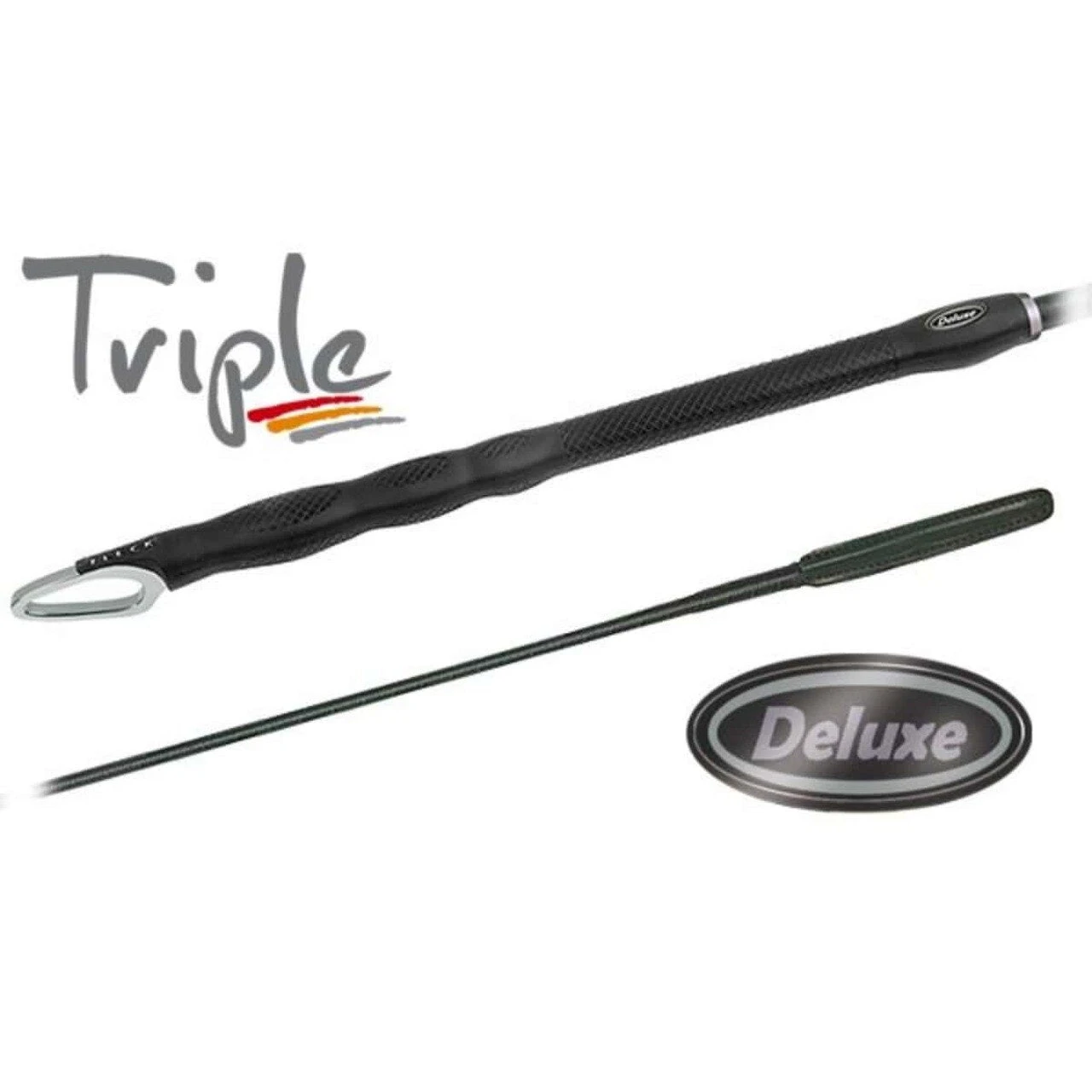 The Fleck Triple Deluxe Dressage whip features a lacquered nylon weave with TripleBalance grip, a flexible whip shaft, and a leather thong.