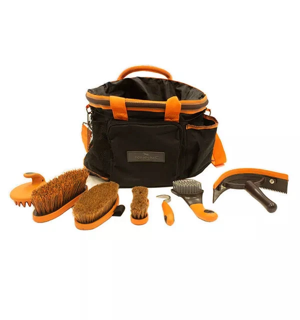 Grooming bag; sweat scraper; face brush; body brush; dandy brush; mane and tail brush; hoof pick; curry comb.