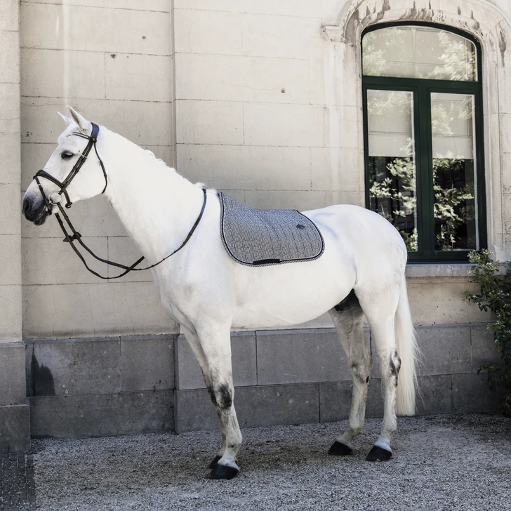 This saddle pad is printed with the Pied-de-Poule pattern, a fashion classic that brings rhythm and elegance, on a microfiber fabric. This saddle pad has a quilted star patten and a double twist piping in similar tones.