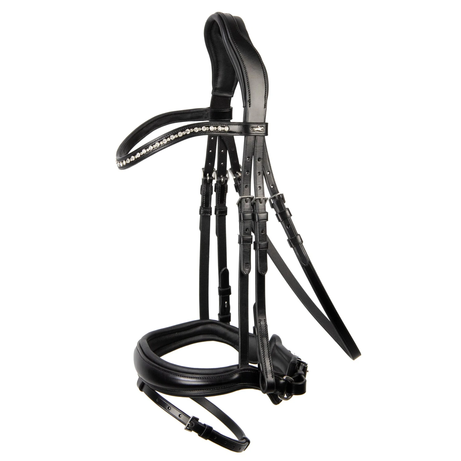 BRANTFORD combines functionality and sporty design: The bridle with an anatomically shaped crank noseband has a unique neck piece. This was specifically adapted to the horse’s anatomy and allows unconfined movement of the ears. Due to the reduction of pressure in sensitive areas around cheekbone and neck, the comfort of the horse is considerably enhanced.