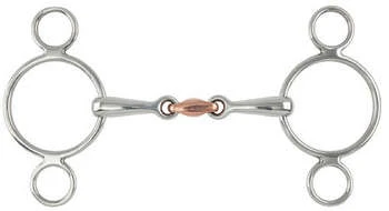 Two ring gag with a copper lozenge, this bit allows the rein to be placed on either the main ring or smaller lower ring for more control, the copper lozenge encourages the horse to salivate.