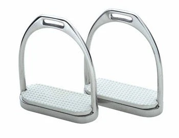 Traditional stainless steel stirrup irons complete with white rubber tread.