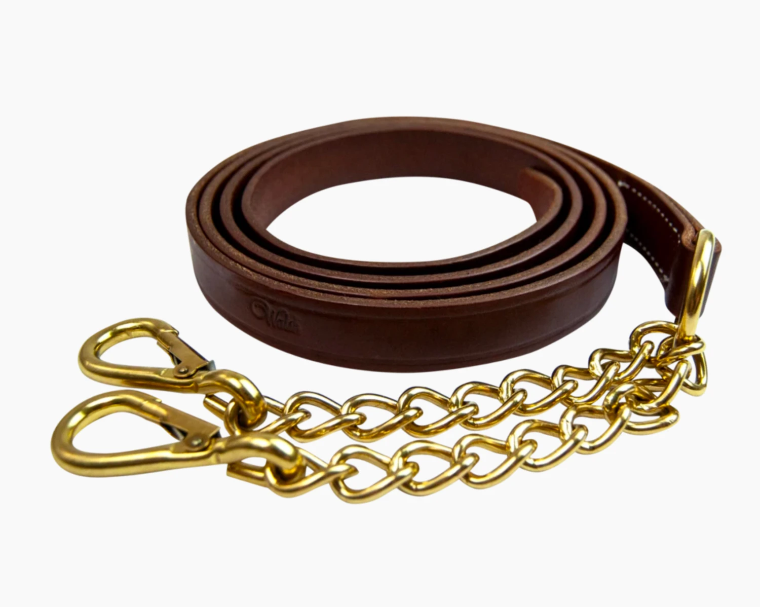 This 6′ long, 1″ wide lead with split 9″ chains is perfect for in-hand or leadline classes. It can be attached to the bit or used as a standard lead on a halter.
